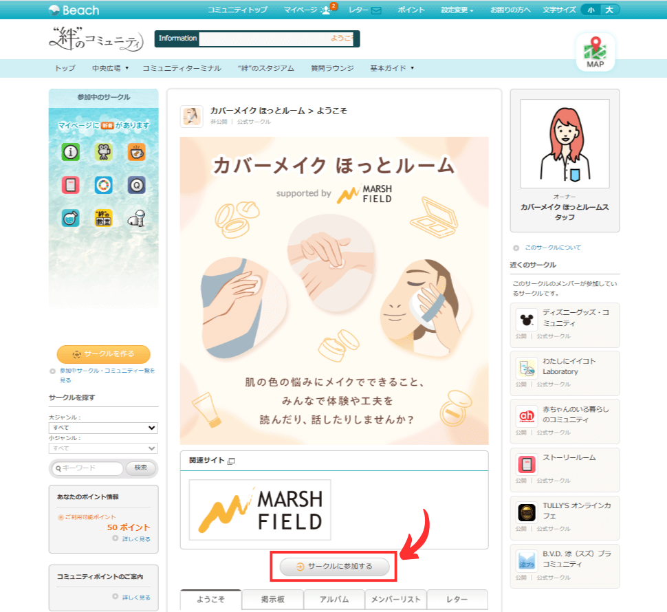 どちらの場合でも、「カバーメイク ほっとルーム」(https://www.beach.jp/circle/af12805)にアクセスし、「サークルに参加する」ボタンから入っていただくとスムーズです。