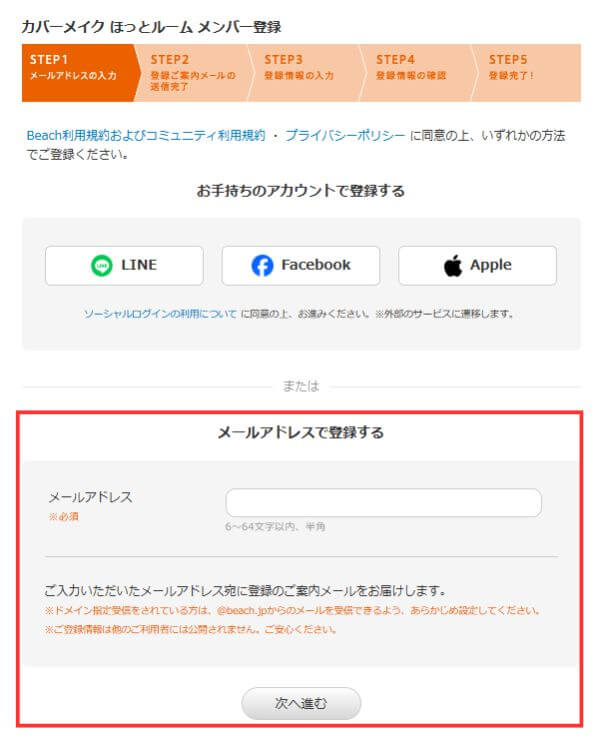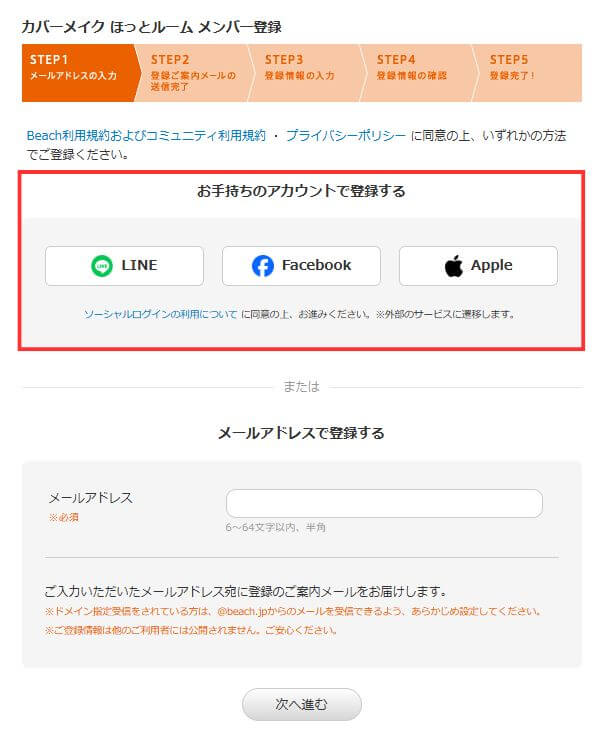 「LINE」「Facebook」「Apple」いずれかのアカウントをお持ちの方は、Beachへのメールアドレスの登録なしで会員になることができます。